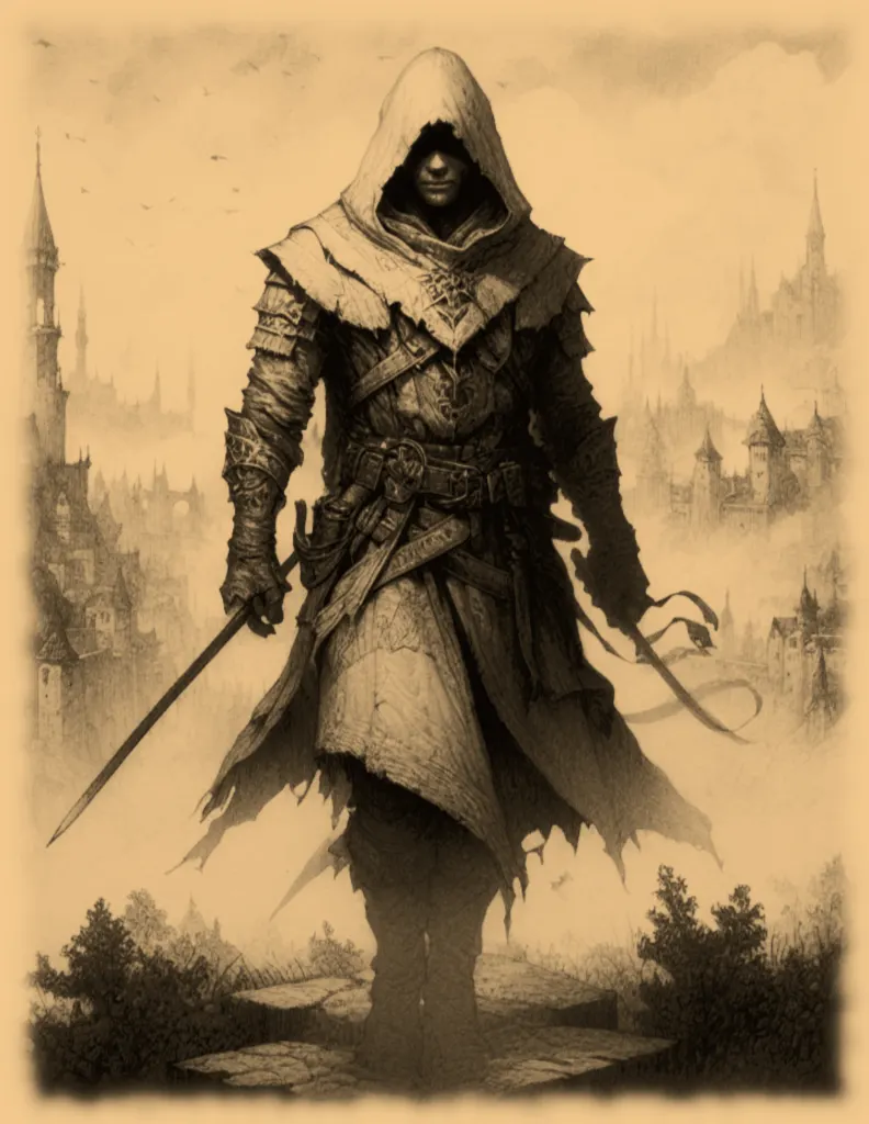 Silenzioso e letale come una pantera nel buio, l’assassino è un maestro dell’inganno e della morte silenziosa. Diversamente dai guerrieri, non combatte guerre in campo aperto, e detesta affrontare il nemico frontalmente armato di pesanti scudi ed armature. Egli preferisce invece protezioni leggere che gli consentono di rimanere nascosto con uno stiletto in mano, attendendo silenziosamente il momento giusto. Egli non sarà mai un grande generale, ma potrà cambiare le sorti delle guerre uccidendo generali nel sonno. Difficilmente sarà Re, ma avrà il potere di deporre quanti sovrani vorrà prima ancora che il popolo se ne renda conto. È il predatore perfetto in un mondo che non perdona i deboli né i lenti. Che agisca per denaro, vendetta o ideali oscuri, l’assassino rimane una figura temuta in ogni angolo di Te’Rha. I sovrani lo ingaggiano in segreto, le corporazioni lo rispettano o lo temono, e persino i più potenti maghi dormono con un occhio aperto, sapendo che nemmeno le barriere arcane possono fermare una lama ben guidata.