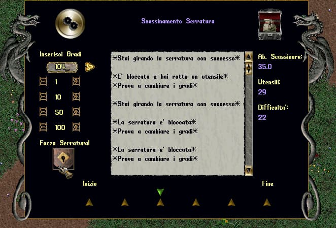 ▶ Scassinare. Attraverso il comando .scassina (o premendo l’icona apposita) si può selezionare un baule o una porta da forzare. Apparirà un menù (immagine a destra) tramite il quale si potrà far scattare la serratura facendo girare lentamente il meccanismo nella direzione corretta e per un numero predefinito di gradi. In base all’abilità, ed al numero di grimaldelli nello zaino (creabili tramite l’abilità “inventare”), si potranno forzare serrature sempre più difficili.
