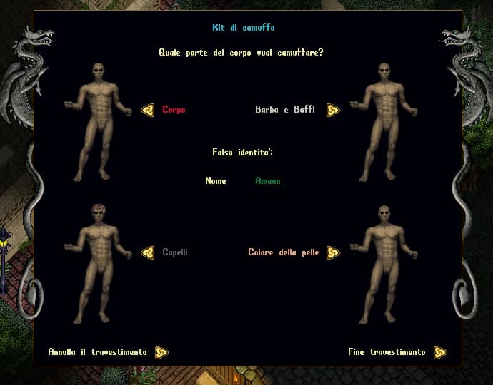 ▶ Camuffo. Tramite il ramo talenti “Mano Lesta”, il ladro potrà cambiare la propria apparenza. Selezionando il kit del camuffo (un oggetto a forma di manichino creabile tramite l’abilità lavorativa “inventare”) apparirà un menù (immagine a sinistra) tramite il quale si potrà cambiare nome, capigliatura, carnagione e persino razza. Maggiore l’abilità posseduta, maggiori saranno le opzioni per camuffarsi.